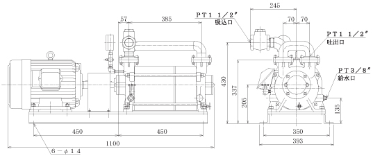 | 型式 \ 仕様 | 電動機 (kW) | 到達圧力 (Pa) | 排気速度 (m3/hr) | 回転数 (r.p.m) | 口径 (mm) | 給水量 (l/min) | 重量 (kg) (M含み) | 寸法 (W×D×H) |