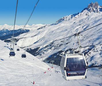 フランス ヴァルディゼールの3線交走式普通索道。キャビンは200人乗り。毎時2,000人を秒速12.5mで輸送が可能。